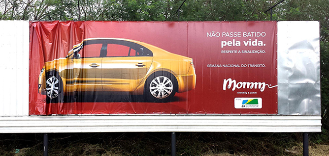 Afin de sensibiliser le public aux accidents de la route, l’agence brésilienne Momm a installée une affiche à São Paulo sur un panneau publicitaire routier. Volontairement froissée, l’annonce donne l’illusion que la voiture sur l’affiche est rentrée violemment en collision : un coup d’éclat simple qui frappe!