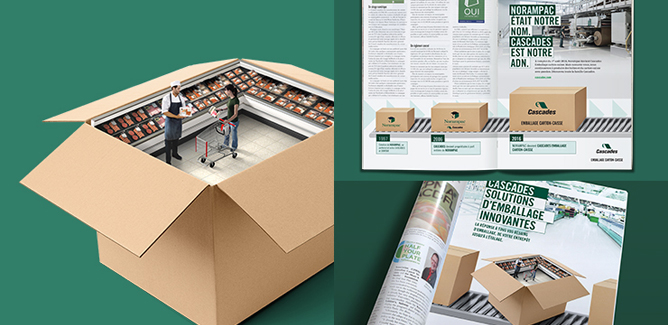 Après avoir remporté un appel d’offres, G l’agence a été mandatée par Cascades pour créer une série de publicités imprimées. Le mandat consistait à faire connaître sa division emballage carton-caisse — anciennement Norampac — à sa clientèle cible. La première publicité annonçait justement ce changement de nom.
