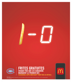 Les fans des Canadiens de Montréal pourront profiter d’une offre unique signée McDonald’s du Canada du 5 octobre au 7 avril. Une première mondiale dans l’univers de McDonald’s, la promotion #McBut permet à tous les utilisateurs de l’application mobile Mon McDo d’obtenir une frite de format moyen gratuite chaque fois que les Canadiens marquent le premier but du match, à domicile comme à l’étranger.