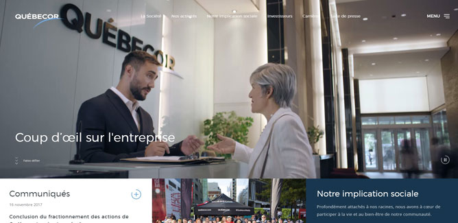 Vitrine pour l’ensemble des activités de Québecor, la plateforme se dote d’un design intuitif qui permet un accès rapide à l’information. De plus, l’entreprise mise sur des contenus allant droit à l’essentiel, sans se substituer aux autres sites de ses filiales. Une place de choix a également été réservée aux visuels originaux afin de bien refléter l’image de l’entreprise et de son milieu. D’ailleurs, la vidéo en page d’accueil a été réalisée par la maison de production Romeo & Fils.