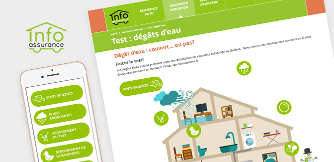 Gabrielle Thibault, designer Web chez MultipleMedia, indique que le projet « dégât d’eau » a été conçu dans le but d’illustrer de manière ludique à « monsieur madame Tout-le-monde » les différents dégâts pouvant survenir dans une maison ou un appartement. L’approche graphique a quant à elle suivi la même lignée d’illustrations simples et joviales développées par l’équipe pour les visuels de la page d’accueil d’Infoassurance.