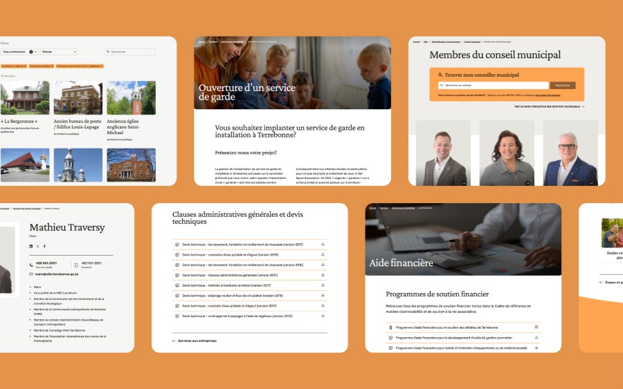 L'accent mis sur l'expérience utilisateur a été au coeur de cette refonte. En automne 2021, la Ville de Terrebonne a lancé un processus de consultation exhaustif, comprenant des entretiens, des sondages et des ateliers. Elle a également fait appel à une entreprise spécialisée dans l'expérience utilisateur, pour concevoir l'architecture des contenus et créer certaines maquettes fonctionnelles, qui ont ensuite été validées par le biais de tests utilisateurs. L'agence a bonifié et finalisé le travail déjà entrepris avant de poursuivre sa mission. L'appel d'offres de la Ville comprenait un document de recommandations techniques pour orienter le développement du nouveau site web. Parallèlement, l'équipe a créé des maquettes filaires et élaboré un cahier des charges qui visait à documenter toutes les fonctionnalités et les interactions du site web. Il a ensuite servi de guide à l'équipe pendant le processus de développement. Une partie du travail consistait donc à aligner les recommandations reçues avec le cahier des charges.