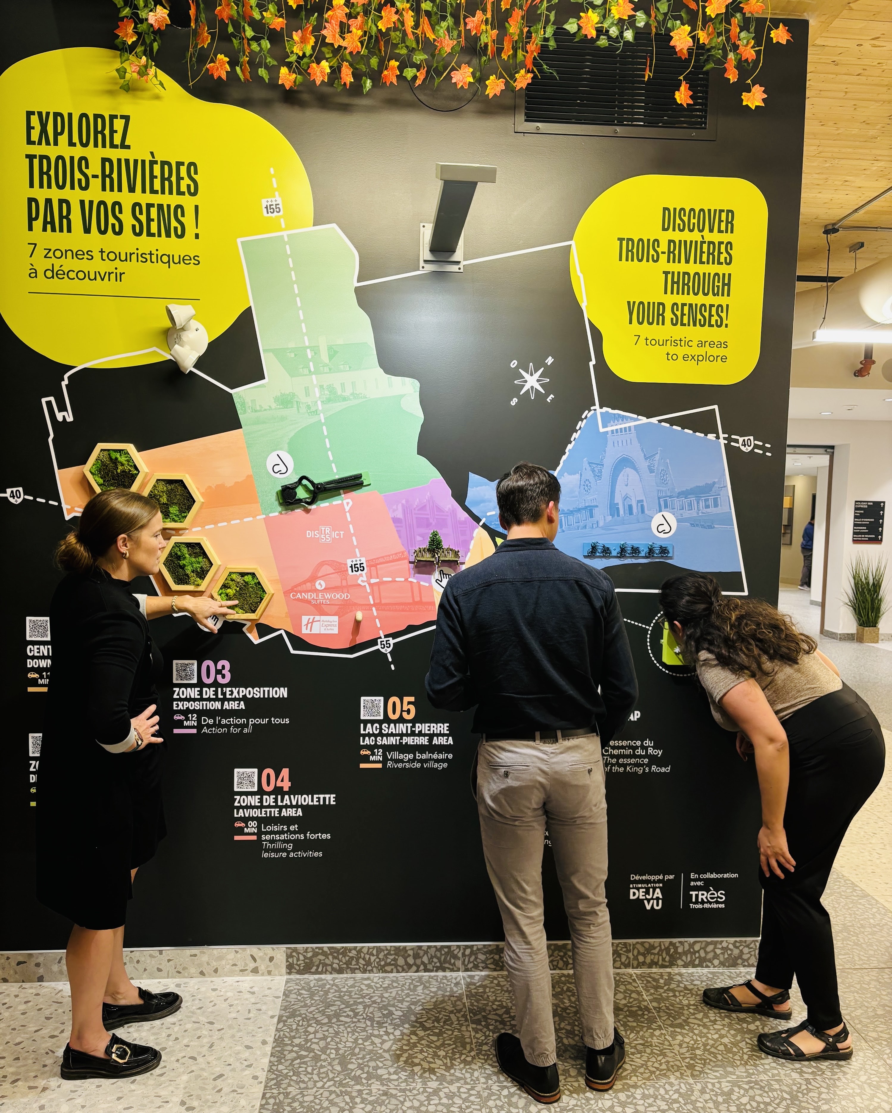 Ce produit offre une immersion totale dans l'univers de la destination, grâce à des mappings muraux enrichis d’éléments surdimensionnés. Les visiteurs peuvent explorer une gamme de sensations, incluant des odeurs, des textures et des sons, tout en découvrant la culture et la richesse de Trois-Rivières. De plus, cette offre est adaptable à divers lieux et destinations, et se décline en plusieurs formats, permettant ainsi une personnalisation selon les besoins spécifiques de chaque établissement.