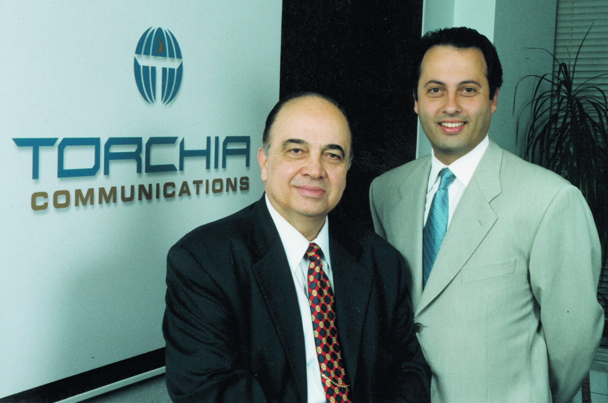 Jean-Claude Torchia en compagnie de son père et associé, Armand Torchia, à Montréal, le 4 juillet 2000, date du lancement de leur entreprise, Torchia Communications.
