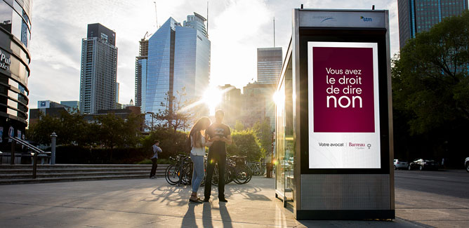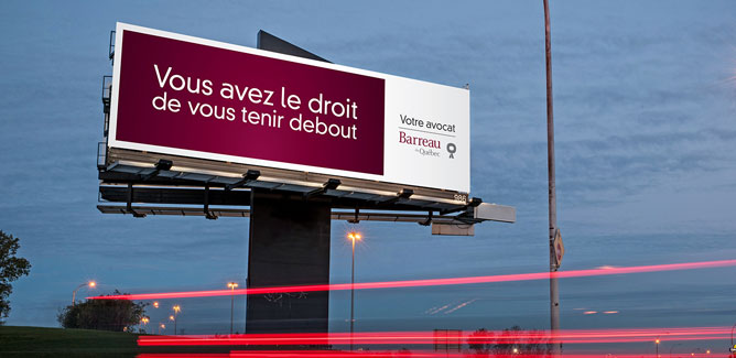 Le Barreau du Québec et son agence partenaire Réservoir lancent une nouvelle campagne publicitaire qui se déploie en affichage, à la télévision et sur les médias sociaux à l’échelle de la province.