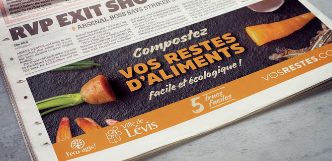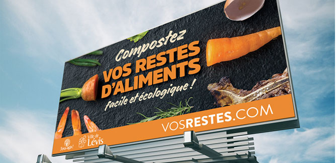 L'agence Les Dompteurs de souris signe le concept de la plus récente opération de communication de la Ville de Lévis. Cette campagne publicitaire cherche à encourager la participation à la collecte des matières compostables. Les objectifs étaient non seulement d’augmenter la participation à cette collecte, mais aussi d’améliorer la perception du compostage, en informant sur ses bienfaits.